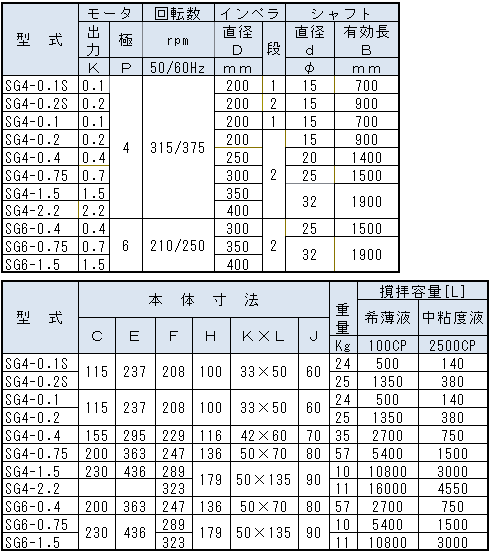 ※立形フランジモーターの0.1Kwが製造が中止になった為、表のSG-0.1は製作不可となっております。