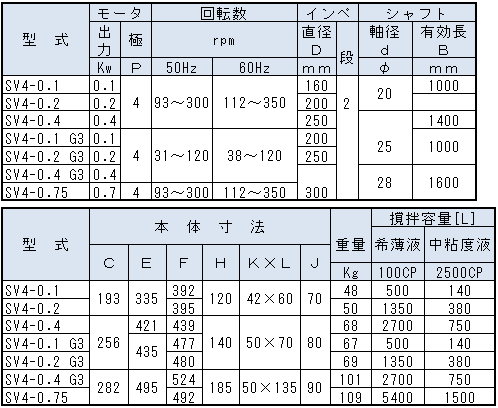 SV型仕様性能・寸法表