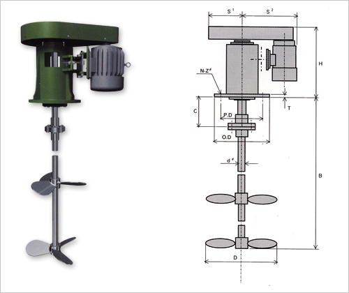 Vベルト減速駆動方式のため運転音は静かです。低、中粘度液で小容量から大容量までの撹拌に適し、標準機種として15Kwまで用意しています。