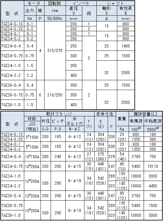 立形フランジモーター0.1Kwの製造が中止になった為、表のTG-0.1は製作不可となっております。